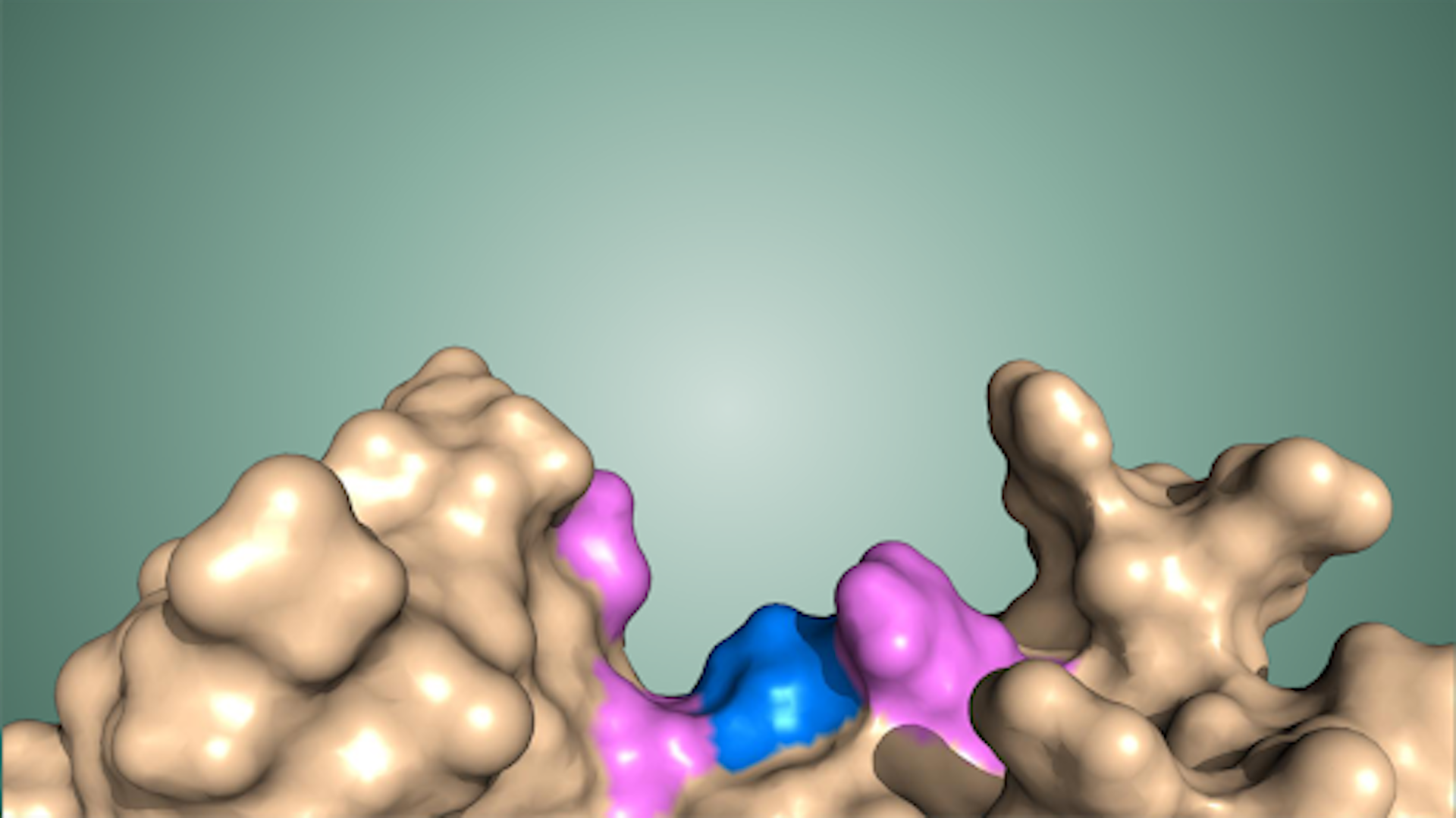 Embora as partes que precisam ficar isoladas da água estejam relativamente expostas, elas não estão soltas. Ficam próximas umas das outras, numa estrutura compacta na superfície da proteína. Nós chamamos esses agrupamentos de “clusters hidrofóbicos de superfície” (veja na figura a superfície da proteína: região hidrofóbica em azul, protegida pela hidrofílica em rosa). Eles atuam como pontos de ancoragem fracos, porém altamente eficientes, facilitando o reconhecimento molecular em um ambiente celular congestionado.